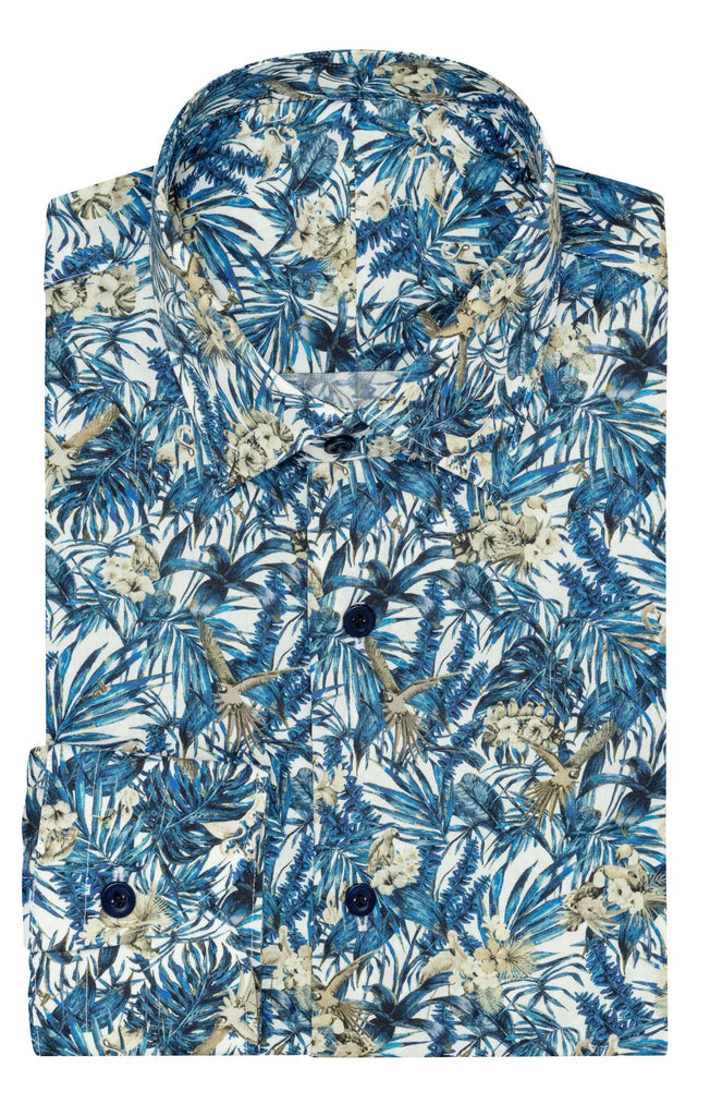 Testa Blue Tropical Leaves And Birds Organic Egyptian Cotton Poplin